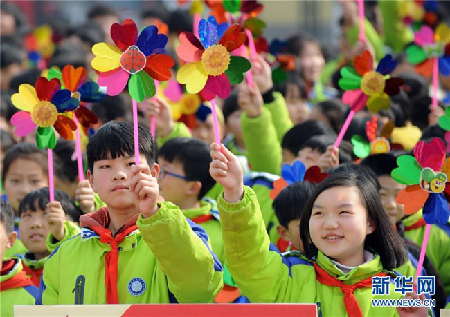 2月25日,安徽省亳州市風(fēng)華桐鄉(xiāng)路小學(xué)的學(xué)生們在新學(xué)期主題活動(dòng)上舞動(dòng)風(fēng)車。 新華社發(fā)(張延林 攝)