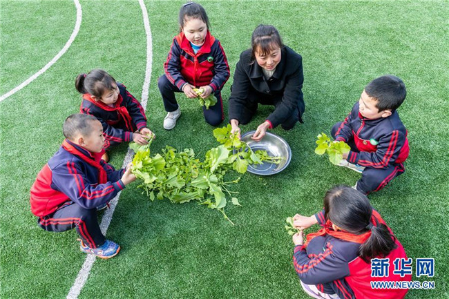 2月25日,在重慶市南川區(qū)慶元鎮(zhèn)福壽村小,教師黃先群和孩子們清洗他們在校園里種的蔬菜,為午飯做準(zhǔn)備,這所“微小學(xué)”只有一名教師和五名學(xué)生。新華社發(fā)(瞿明斌 攝)