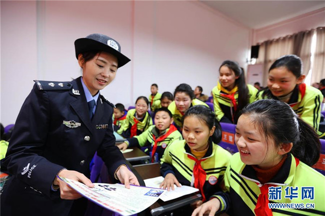 2月25日,在貴州省赤水市第三小學(xué),民警在開學(xué)第一課上給學(xué)生們講解校園安全知識(shí)。 新華社發(fā)(王長育 攝)