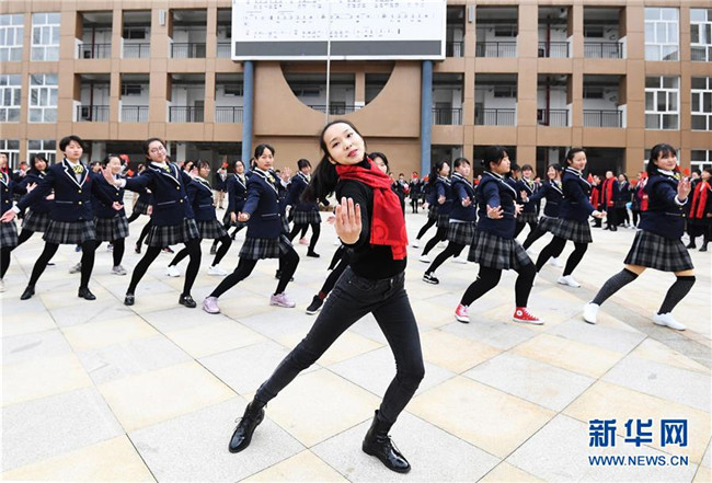 2月25日,貴州省貴陽市南明區(qū)甲秀高中的師生在開學(xué)主題活動(dòng)上表演“快閃”節(jié)目《我和我的祖國》。新華社發(fā)(趙松 攝)