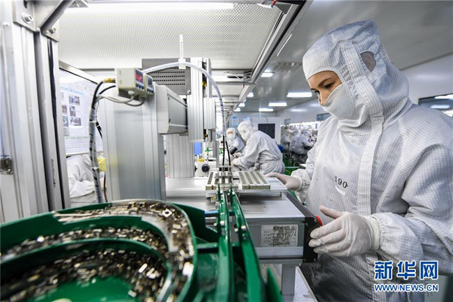 2月23日,在內(nèi)蒙古包頭市江馨微電機(jī)公司的生產(chǎn)線中,工作人員用自動(dòng)擺盤(pán)設(shè)備將部件擺放在組裝工具上。 新華社記者 彭源 攝