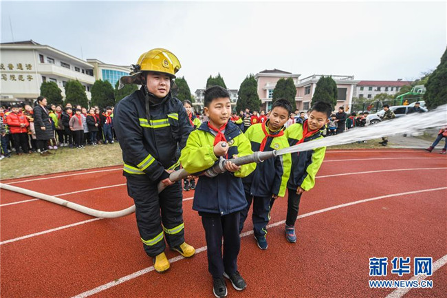 3月6日,東林鎮(zhèn)消防應(yīng)急救援隊的隊員帶領(lǐng)小學(xué)生們體驗水槍的使用。當(dāng)日,浙江省湖州市吳興區(qū)東林鎮(zhèn)東林小學(xué)舉行“開學(xué)第一課”消防安全進校園活動。東林鎮(zhèn)消防應(yīng)急救援隊的隊員們通過普及消防安全知識、應(yīng)急逃生知識等內(nèi)容,讓學(xué)生們了解日常消防安全常識,增強消防安全意識。新華社記者 徐昱 攝