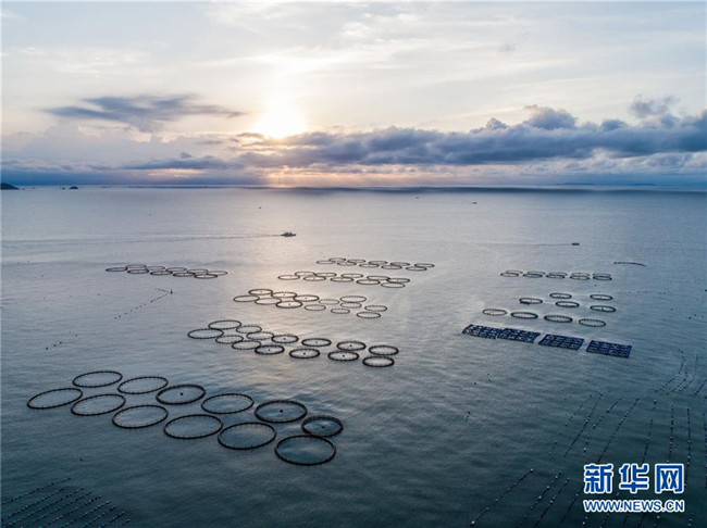 夕陽映照下的浙江省溫州市平陽縣南麂島馬祖岙海域,圓形的都是大黃魚養(yǎng)殖網(wǎng)箱(2018年8月18日無人機(jī)拍攝)。新華社記者 徐昱 攝
