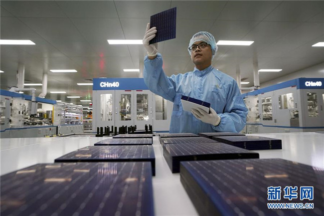 英利能源(江西)有限公司員工在檢測(cè)光伏電池片(2018年12月11日攝)。新華社記者 宋振平 攝
