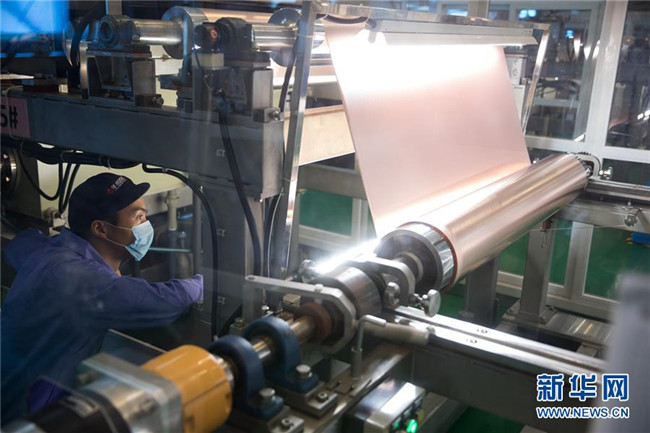 在安徽省銅陵市華創(chuàng)新材料有限公司生產(chǎn)車(chē)間,一名員工在監(jiān)測(cè)鋰電銅箔生產(chǎn)過(guò)程(2018年8月8日攝)。新華社記者 金立旺 攝
