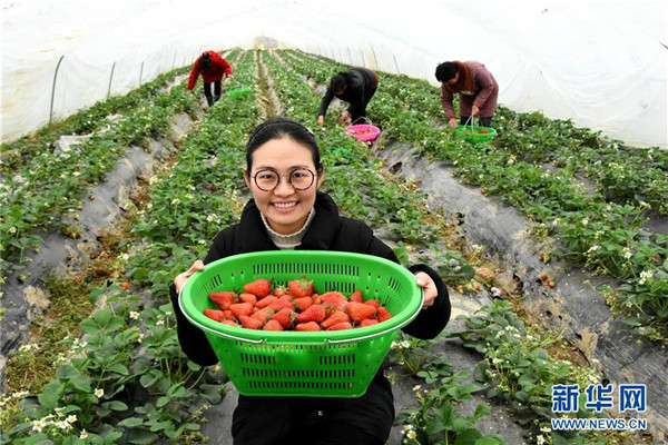 2018年2月27日,王萌萌展示剛采摘的草莓。全國(guó)人大代表王萌萌是安徽省定遠(yuǎn)縣西孔村一名大學(xué)生“村官”,她帶領(lǐng)村民建立起草莓園、蔬菜園、育秧工廠等特色項(xiàng)目,吸引游客前來(lái)采摘,村民的日子越過(guò)越紅火。 新華社發(fā)(馮再雷 攝)