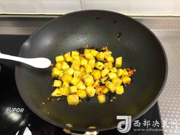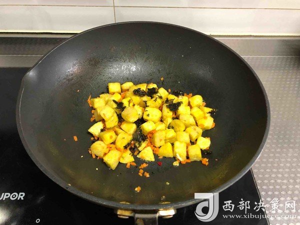 5.起鍋少量油,燒熱下饅頭粒翻炒均勻