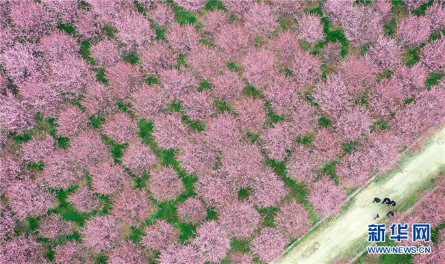 3月19日,游人在陜西勉縣新街子鎮(zhèn)觀賞美人梅(無人機拍攝)。近日,陜西省漢中市勉縣新街子鎮(zhèn)數十畝美人梅開放,吸引游人前來踏春賞花。 新華社記者 劉瀟 攝
