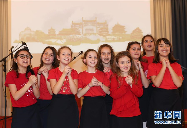 這是2019年2月8日,在意大利拉齊奧的古鎮(zhèn)蒂沃利,蒂沃利國立住讀學(xué)校的學(xué)生們在中國春節(jié)慶?;顒由辖o大家拜年。 新華社記者 程婷婷 攝