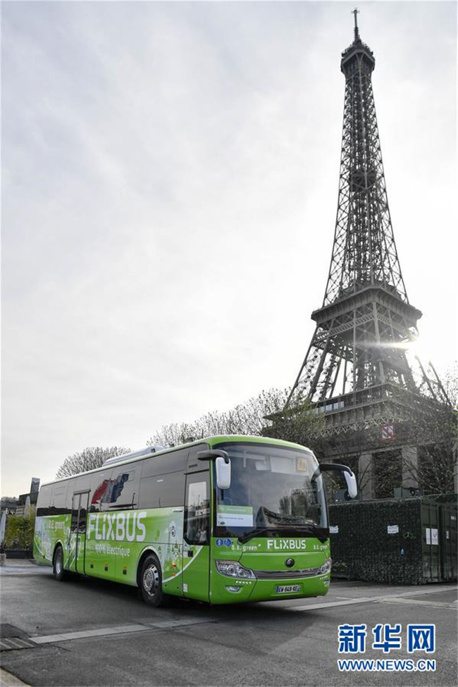 這是2018年4月10日在法國巴黎拍攝的中國宇通電動客車。這輛59座電動客車在法國巴黎至亞眠的城市間長途客運(yùn)線路上運(yùn)營。 新華社記者 陳益宸 攝