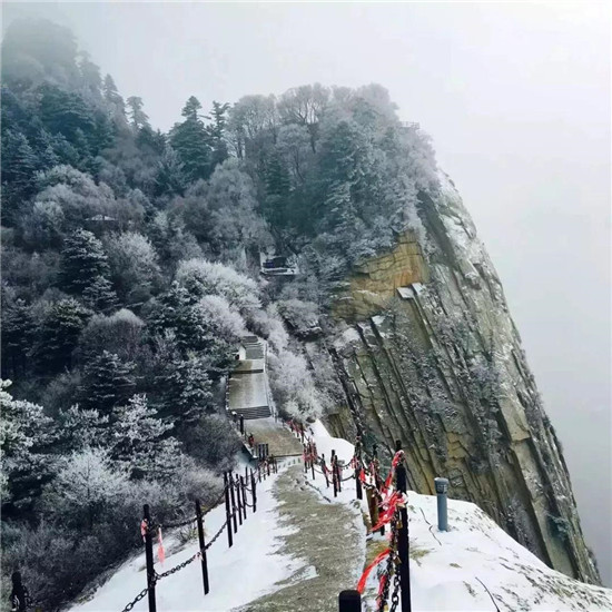 量掌山雖矮于華山主峰,但山峰險(xiǎn)峻,危崖聳立,崖體裸露呈赭色,巖石皴理異常美麗,其造化之妙如出畫家之手。尤其是在陽(yáng)光照耀下,更加燦爛輝煌,雄奇壯觀。攀登量掌山的道路非常險(xiǎn)峻,古時(shí)除一些羽林高手外,很少有人登峰。