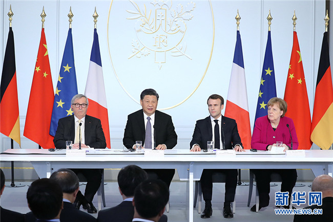 3月26日,國家主席習(xí)近平在巴黎同法國總統(tǒng)馬克龍一道出席中法全球治理論壇閉幕式。德國總理默克爾、歐盟委員會主席容克應(yīng)邀出席。 新華社記者 鞠鵬 攝