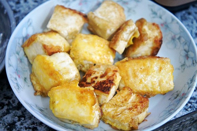 4.炒鍋加入適量的油,每一片豆腐都裹上蛋液,入鍋煎