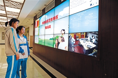海淀教師進修學校附屬實驗學校(北校區(qū))大屏幕實時直播后廚情況。 新京報記者 王遠征 攝