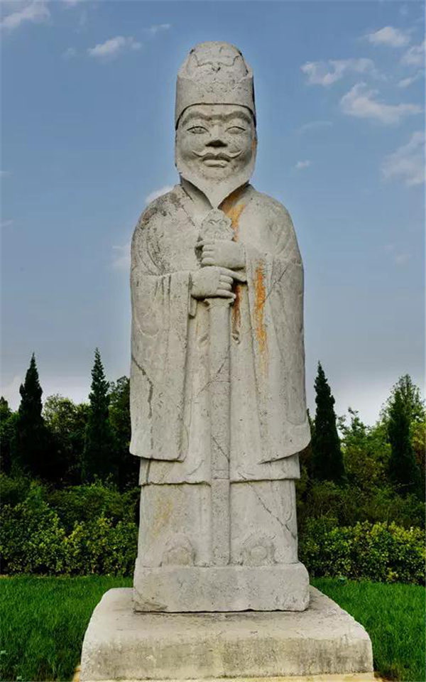 橋陵的石人身高都在4米左右,一個(gè)個(gè)面帶微笑,表情豐富,顯得氣度不凡,雍容華貴,反映了盛唐社會(huì)的和諧安定,經(jīng)濟(jì)上的欣欣向榮。雙眼皮、美人痣、波浪形的胡子讓你驚嘆雕刻手法的細(xì)膩傳神,尤其是1300年后連人的指甲蓋你都看的是一清二楚。