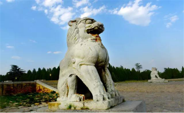 在橋陵的石雕中,特別值得一提的是橋陵的一對(duì)石獅子,歷經(jīng)千年的風(fēng)雨侵蝕,可威風(fēng)依然不減當(dāng)年,四肢健壯、昂首挺胸、怒目圓睜,顯示出“天地之間,唯我獨(dú)尊”的傲氣、霸氣,它造型優(yōu)美,氣勢(shì)磅礴,體現(xiàn)出唐代粗礦、奔放的時(shí)代氣息,而最讓人叫絕的是它的尾巴,從腿底鉆進(jìn)又掏出來(lái)卷曲于背部,動(dòng)物的調(diào)皮可愛(ài)活靈活現(xiàn)展現(xiàn)在我們眼前。它是石刻中的精品,石刻的精美,氣魄的宏大,堪稱“東方第一獅”。像這樣的獅子四個(gè)門前都有,保存的特別完好,東門的回頭望,西門的卷舌獅在唐代帝王陵中都是絕無(wú)僅有的。