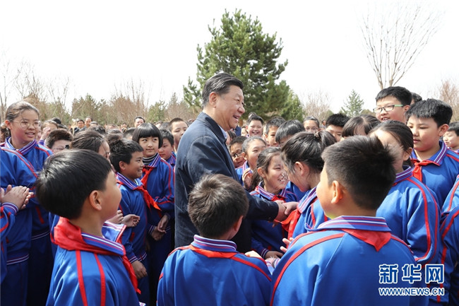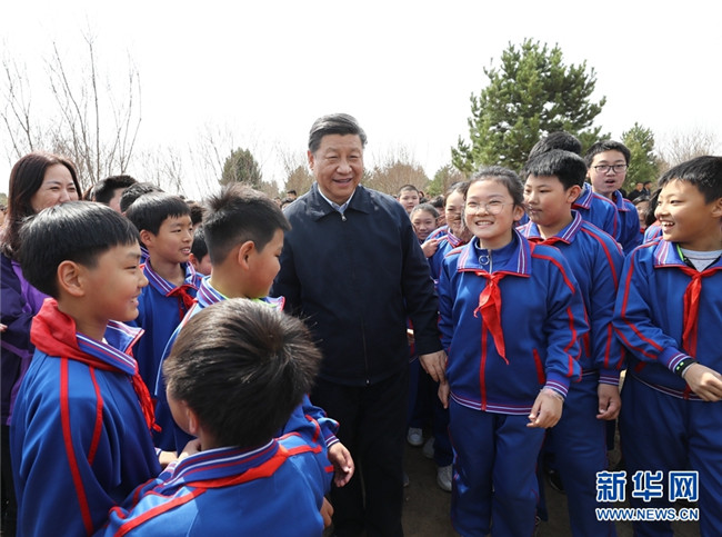 4月8日,黨和國(guó)家領(lǐng)導(dǎo)人習(xí)近平、栗戰(zhàn)書、汪洋、王滬寧、趙樂際、韓正、王岐山等來到北京市通州區(qū)永順鎮(zhèn)參加首都義務(wù)植樹活動(dòng)。這是習(xí)近平同少先隊(duì)員在一起。 新華社記者 鞠鵬 攝