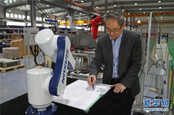 3月29日,沈陽(yáng)新松機(jī)器人自動(dòng)化股份有限公司創(chuàng)始人兼總裁曲道奎和公司生產(chǎn)的機(jī)器人共同書(shū)寫(xiě)“愛(ài)國(guó)奮斗”字樣。 新華社記者 楊青 攝
