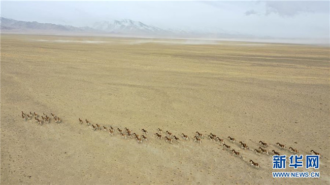 藏野驢奔跑在阿爾金山國家級自然保護區(qū)內(nèi)(3月31日無人機拍攝)。 新華社記者 胡虎虎 攝