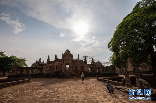 4月5日,游客參觀泰國武里南府低城寺。 一年一度的“登帕儂隆山節(jié)”在泰國東北部毗鄰柬埔寨的武里南府帕儂隆山舉辦。當(dāng)?shù)厝艘怨叛b巡游展示獨特的傳統(tǒng)文化,希望能吸引更多外國游客、促進當(dāng)?shù)芈糜螛I(yè)發(fā)展。 新華社記者 張可任 攝