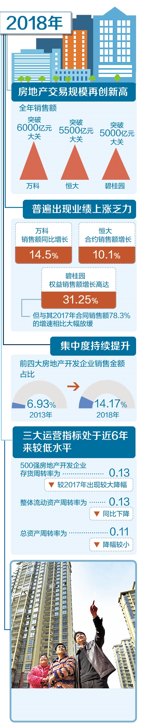 2018年,房地產(chǎn)交易規(guī)模再創(chuàng)新高,萬科、恒大、碧桂園全年銷售額紛紛突破6000億元、5500億元、5000億元大關(guān)。但在調(diào)控政策從緊的環(huán)境下,房企普遍出現(xiàn)業(yè)績上漲乏力現(xiàn)象。年報(bào)顯示,2018年萬科銷售額同比增長14.5%,恒大合約銷售額增長10.1%,增速同比均有所放緩。雖然2018年碧桂園權(quán)益銷售額增長高達(dá)31.25%,但與其2017年合同銷售額78.3%的增速相比亦大幅放緩。