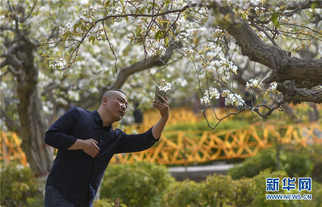 4月9日,一名市民在庫爾勒市梨香園中拍照。 新華社記者趙戈攝