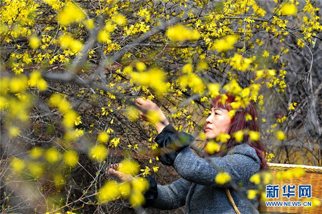 4月10日,平定縣冠山鎮(zhèn)后溝村的村民在采摘連翹葉。