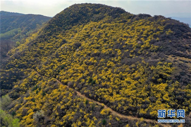 連翹花盛開在平定縣冠山上(4月10日無人機(jī)拍攝)。