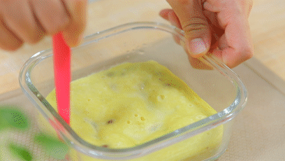 8.模具底部刷 油,鋪一層油紙。 家里如果沒(méi)有模具,就拿一個(gè)耐高溫的玻璃蒸碗吧!