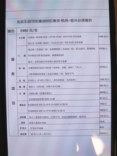 海淀區(qū)某中學(xué)則向家長(zhǎng)公開(kāi)了收費(fèi)明細(xì)。在家長(zhǎng)王先生提供的游學(xué)清單上,記者看到5天的研學(xué)旅行費(fèi)用為3980元,游覽地點(diǎn)包括南京大屠殺遇難同胞紀(jì)念館、西湖和魯迅紀(jì)念館等。行程中還設(shè)置了眾多教育內(nèi)容,比如參加南京大學(xué)講座、著漢服行謝師禮、探究杭州西湖的光學(xué)現(xiàn)象等。