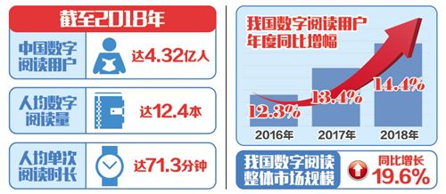 4月12日至14日,第五屆中國(guó)數(shù)字閱讀大會(huì)在杭州召開。會(huì)上發(fā)布的《2018年度中國(guó)數(shù)字閱讀白皮書》顯示,截至2018年,中國(guó)數(shù)字閱讀用戶總量達(dá)到4.32億,人均數(shù)字閱讀量達(dá)到12.4本,人均單次閱讀時(shí)長(zhǎng)達(dá)71.3分鐘。我國(guó)數(shù)字閱讀整體市場(chǎng)規(guī)模已達(dá)到254.5億元,同比增長(zhǎng)19.6%,大眾閱讀市場(chǎng)規(guī)模占比逾九成,是產(chǎn)業(yè)發(fā)展主導(dǎo)力量。