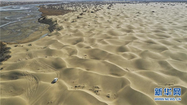 依明乘坐的汽車行駛在塔克拉瑪干沙漠中。從依明家坐車前往于田縣城,全程不足300公里,越野車需行駛7小時(shí)左右(3月19日無(wú)人機(jī)拍攝)。新華社記者 胡虎虎 攝