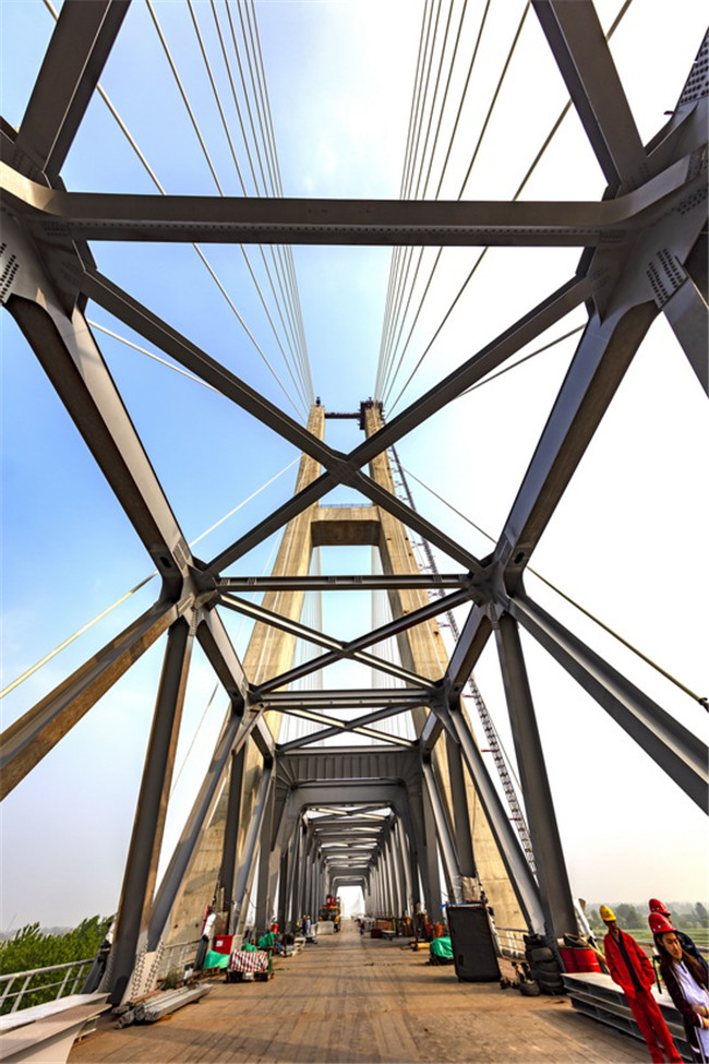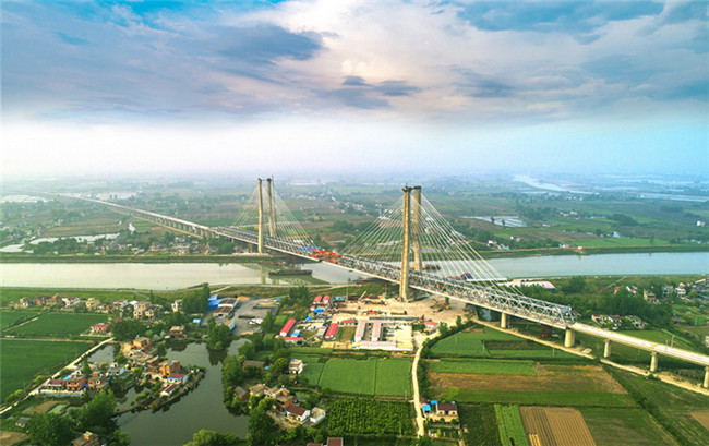商合杭鐵路重點控制性工程裕溪河特大橋,主橋全長686米,主塔采用“H”型索塔,塔高123米。在我國時速350公里高速鐵路大跨度斜拉橋建設(shè)中,首次使用鋼箱桁梁結(jié)構(gòu)形式,首次在300米以上跨度橋梁中采用無砟軌道結(jié)構(gòu)形式,大橋主跨跨度達324米,建成后將成為目前世界最大跨度的無砟軌道高速鐵路橋梁。