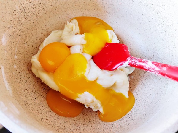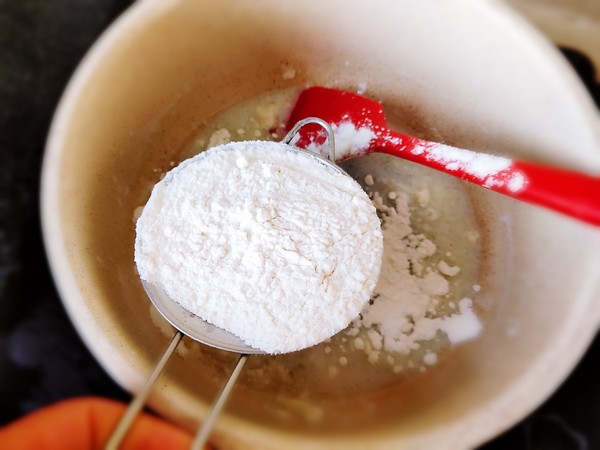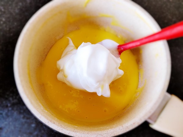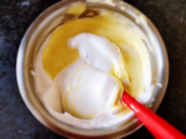 8.拌勻后,倒回蛋白霜之內,繼續(xù)上下翻拌均勻。