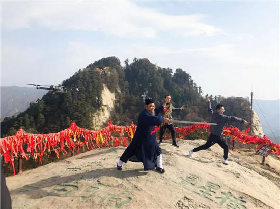 《百家講壇》魏新學(xué)者、《奇葩說(shuō)第五季》清華名嘴楊奇函及中國(guó)道教協(xié)會(huì)車(chē)道長(zhǎng)在西峰頂拍攝《華山論劍》文化旅游紀(jì)念片