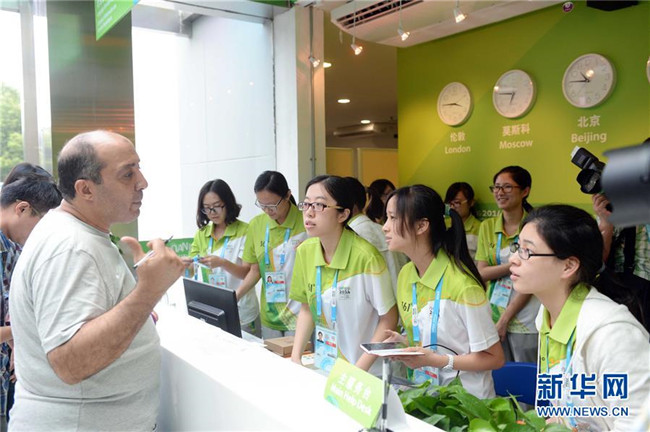 2014年8月14日, 2014南京青奧會(huì)志愿者在主媒體中心回答一名外國記者的咨詢。新華社記者陳曄華攝