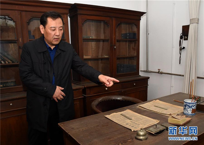 北京新文化運動紀念館副館長李金光在北大紅樓中介紹當(dāng)年圖書館主任李大釗的辦公室(4月9日攝)。新華社發(fā)(任超 攝)