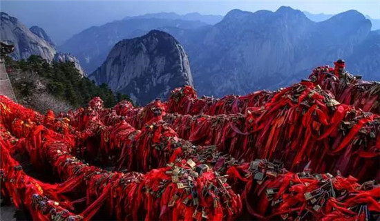 蓮花峰因?yàn)橐粋€(gè)傳說(shuō)故事而得名,即《寶蓮燈》沉香劈山救母。便是指這華山西峰了。石徑兩邊的保護(hù)鏈上掛滿了祈福的金鎖。這也成為了華山一景。