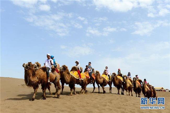 游客在新疆鄯善縣庫木塔格沙漠公園騎駱駝游覽(5月2日攝)。 新華社發(fā)(丁磊攝)