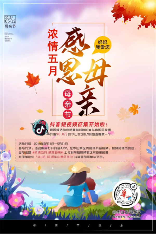 參與方式:5月12日——5月27日活動期間打開抖音APP,在華山景區(qū)內拍攝抖音短視頻,視頻拍攝成功后,參與話題 #濃情五月 感恩母親# 上傳發(fā)布短視頻表達對母親的愛,并添加定位“華山”和 @華山景區(qū)旅游 官方抖音號(925503834)即可參與活動。