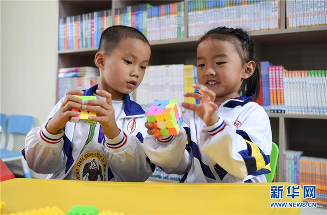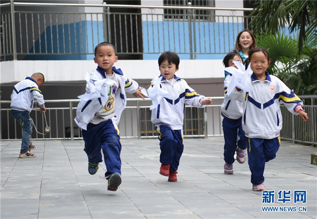 5月14日,在銅仁市松桃苗族自治縣盤石鎮(zhèn)響水洞村的山村幼兒園,孩子們?cè)谕婺Х?。新華社發(fā)(龍?jiān)?攝)