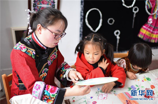 5月14日,在銅仁市松桃苗族自治縣盤信鎮(zhèn)后寨村的山村幼兒園,教師在輔導(dǎo)學(xué)生學(xué)習(xí)苗繡。新華社發(fā)(龍?jiān)?攝)