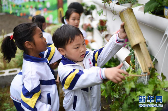 5月14日,在銅仁市松桃苗族自治縣盤石鎮(zhèn)響水洞村的山村幼兒園,孩子們?cè)跒樵耘嗟闹参餄菜P氯A社發(fā)(龍?jiān)?攝)