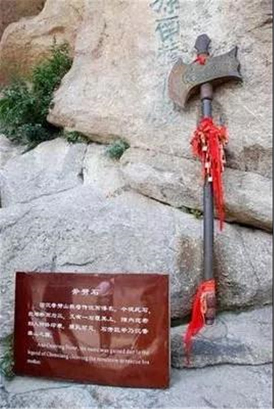 華山西峰就是《寶蓮燈》中沉香劈山救出三圣母的地方。翠云宮旁有一名為“斧劈石”的巨石,中間裂開,如同被斧劈開,旁邊還立著一柄長把大斧。據(jù)說是當(dāng)年沉香救母使用的神兵。