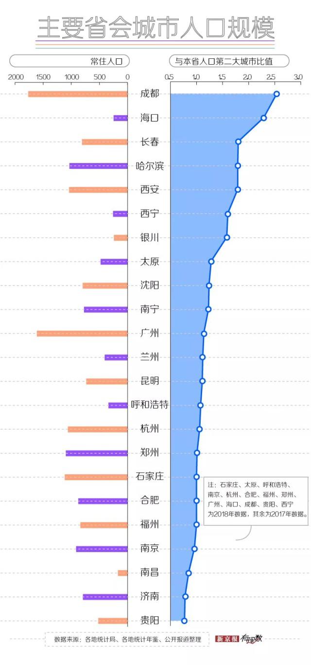 我們可以分三個區(qū)間來看下方數(shù)據(jù)圖中標示的“與本省人口第二大城市比值”:比值大于 1 說明該省會的人口規(guī)模全省第一,比值等于 1 說明該省會是全省人口第二大城市,比值小于 1 說明該省會的人口規(guī)模要排在全省第三甚至更后。