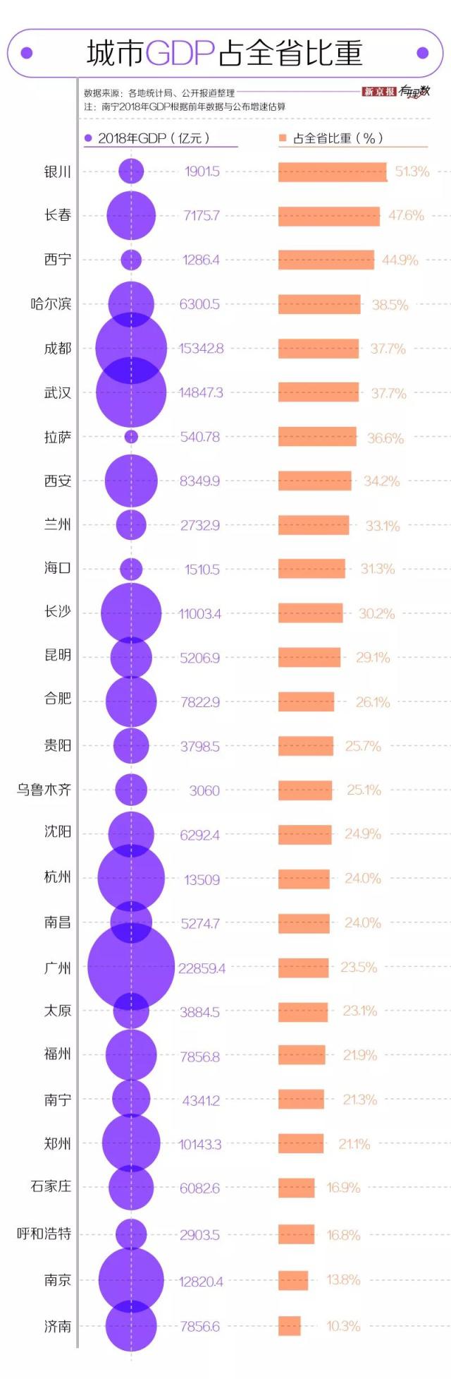 我們梳理了 27 個省和自治區(qū) 2018 年的地區(qū)生產(chǎn)總值后發(fā)現(xiàn),目前西藏、青海、寧夏、海南、甘肅五地 GDP 未破萬億,所以相應的拉薩、西寧、銀川、???、蘭州留給大家的記憶點可能不多;而像江蘇、山東兩地 GDP 可以排在全國前十,但其省會城市南京、濟南的 GDP 占全省比重不到 15%。