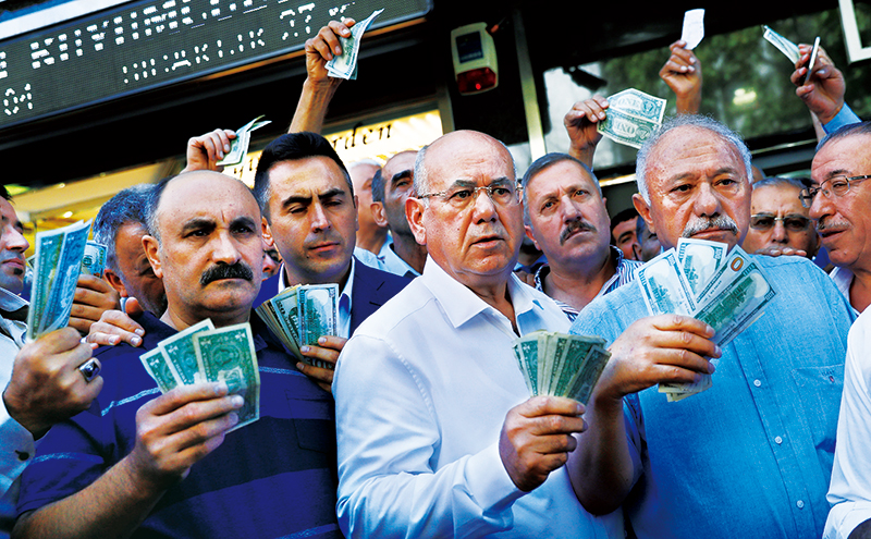 2018年,由于美聯(lián)儲加息導(dǎo)致國際游資大規(guī)?;亓鳎绹鴮ν炼?、伊朗進行制裁以及貿(mào)易保護主義的影響,俄羅斯、阿根廷、土耳其、南非等不少經(jīng)濟體貨幣遭遇大幅貶值。圖為2018年8月14日,在土耳其首都安卡拉,人們響應(yīng)政府號召,手持美元站在貨幣兌換處前,出售手中的美元支持本國貨幣里拉。 新華社/路透