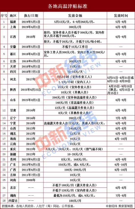 中新經(jīng)緯客戶端注意到,截至2019年5月23日,部分地區(qū)的高溫津貼實(shí)施辦法已超過有效期,這些省份或可能對(duì)高溫津貼標(biāo)準(zhǔn)進(jìn)行調(diào)整。
