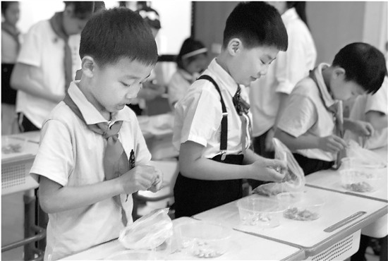 看起來(lái),這些孩子都訓(xùn)練有素。學(xué)校二(1)班班主任袁玲玲告訴記者,一個(gè)月前,蔣校長(zhǎng)就給孩子們布置了剝毛豆的作業(yè)。