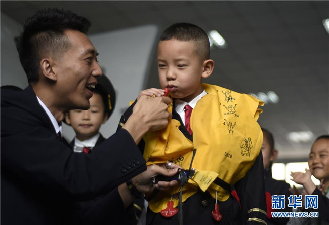 5月27日,在蘭州文理學(xué)院航空模擬訓(xùn)練艙,空乘人員引導(dǎo)小朋友體驗(yàn)救生衣使用方法。